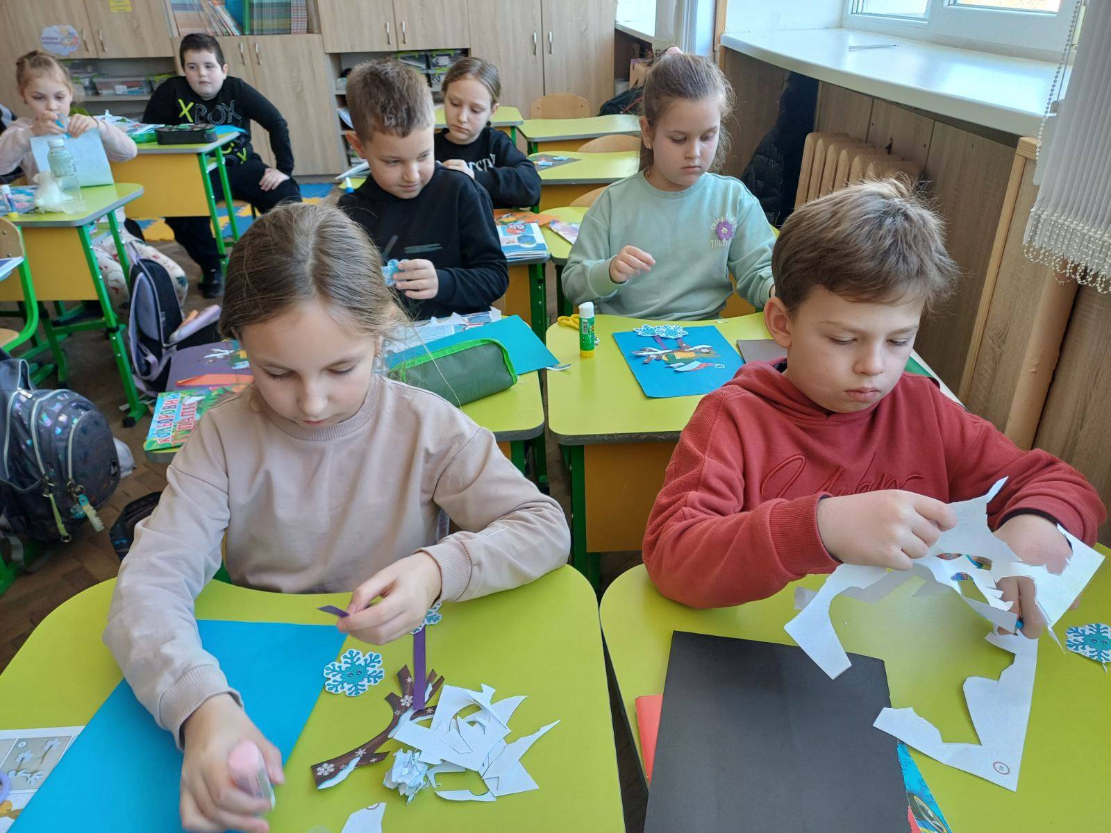 Практична частина уроку була особливо цікавою — учні виготовляли аплікацію синички . У класі також є годівничка, яку ми прилаштували до вікна, тож діти мають змогу щодня піклуватися про пернатих друзів. Такий урок не лише поєднав знання з різних предметів, а й допоміг дітям зрозуміти просту істину: *турбота про птахів узимку — це маленька, але дуже важлива справа .